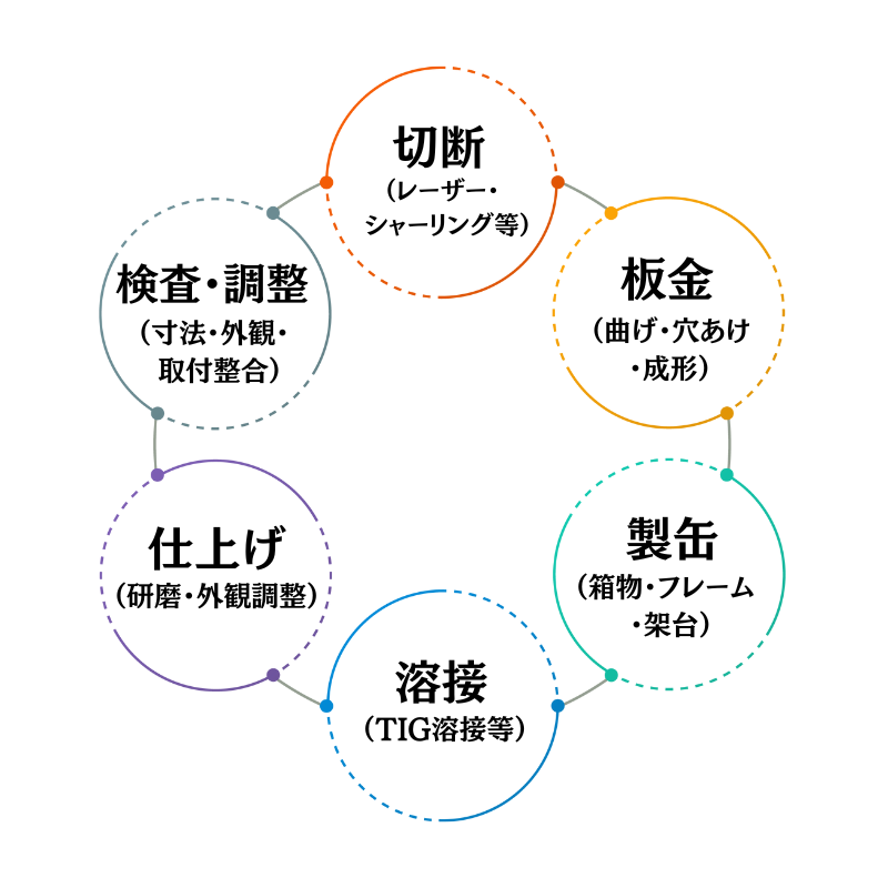 ・加工範囲:板金(曲げ・穴あけ)/製缶(箱物・架台)/溶接(TIG等)/仕上げ(研磨等)
