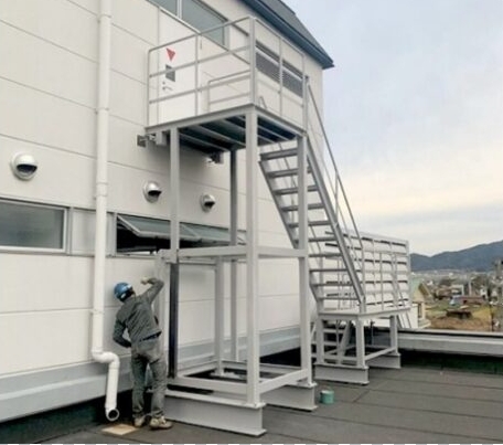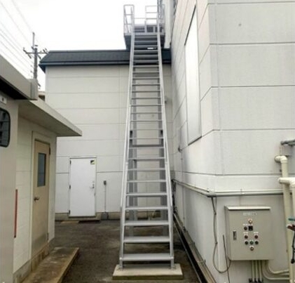 対応:避難階段を製作し、クレーンを用いて建屋越えで設置。非常時に確実に機能する動線を整備しました。